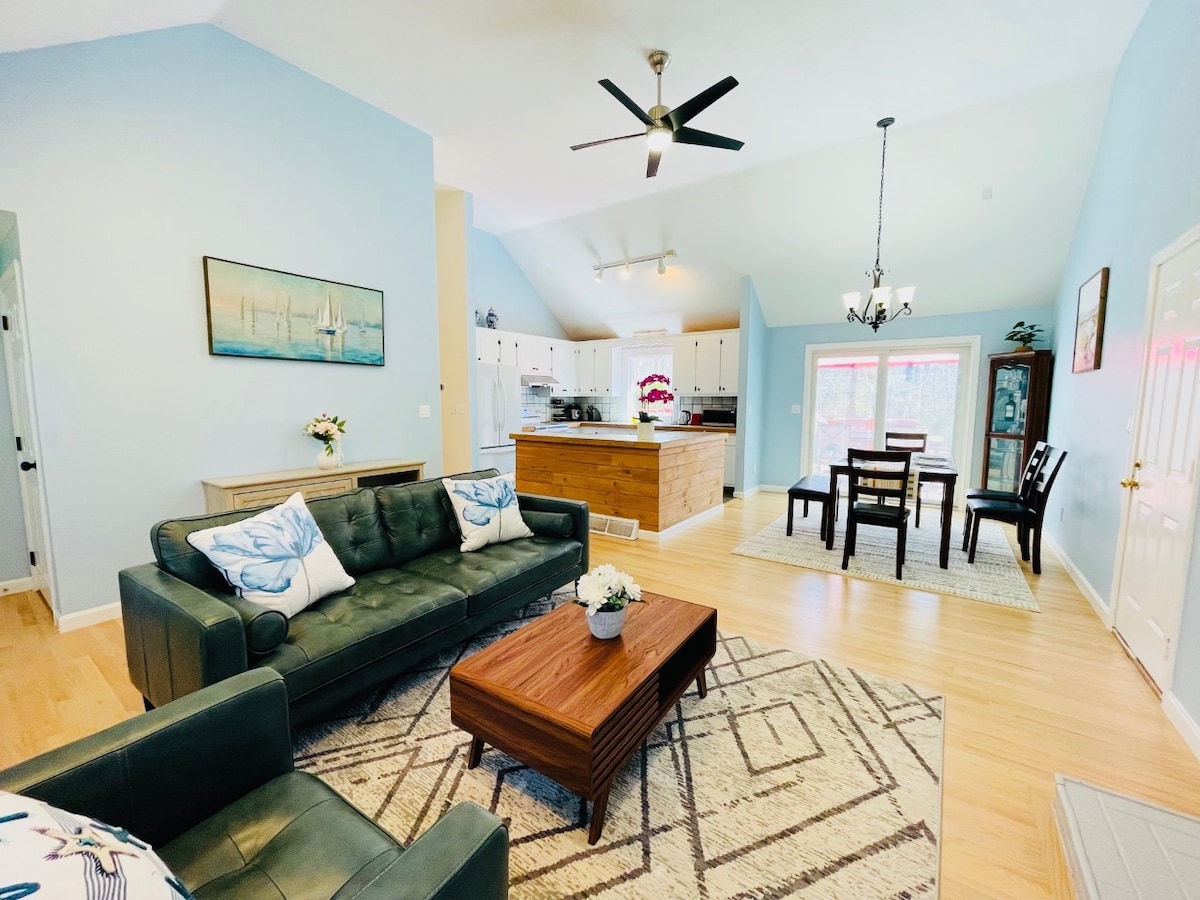 Sæt, björt 4 árstíða einbýlishús með þremur svefnherbergjum, tveimur fullbúnum baðherbergjum, miðlægri loftræstingu og risastórri útisturtu í Harwich, MA. Heimilið er baka frá veginum og laufskrúðið býður upp á næði og stóran bakgarð. Aðalbústaðurinn státar af glæsilegum, breiðum furugólfum og opnu hugmyndagólfi með björtu og fullbúnu eldhúsi og háu hvolfþaki. Með risastórum bakgarði með miklu næði er það fullkomið til að slaka á með vinum og fjölskyldu. Nálægt hjólastíg.
