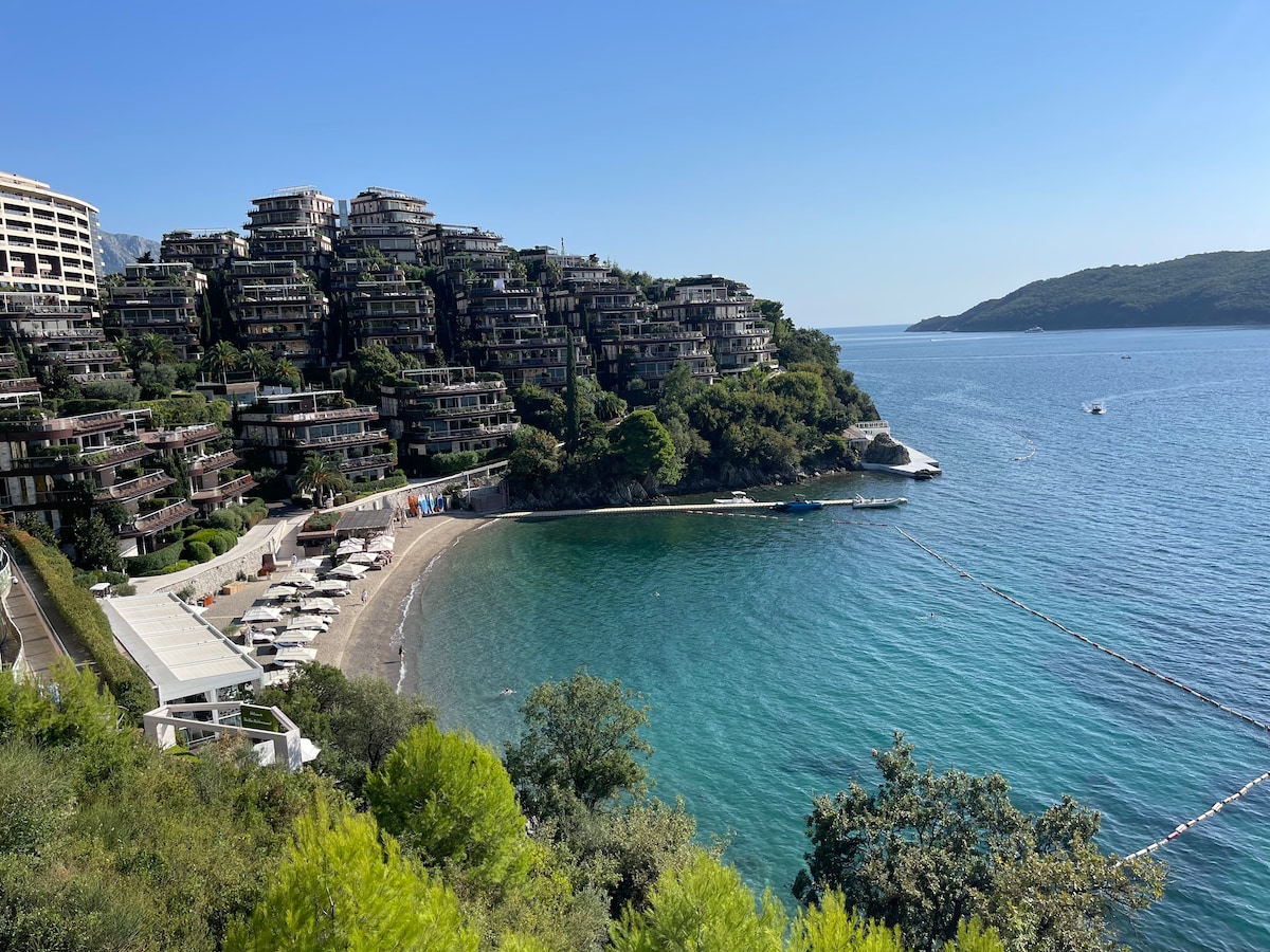 Fullbúin 2 herbergja íbúð með 2 baðherbergjum er staðsett á efstu hæð 2 saga með upphituðum sundlaugum, stórum tvöföldum svölum og glæsilegu útsýni yfir sjó og fjöll. Í nokkurra mínútna fjarlægð frá Becici-ströndinni og stutt að fara á sögufræga staði Budva frá miðöldum og líflegt næturlíf. Njóttu þess að versla, borða og rölta meðfram ströndinni í Becici. Sjónvarp, ísskápur, frystir, ofn, miðstöð, loftræsting, þvottavél, eldhúsbúnaður, frístandandi einkabílastæði. Þetta er frábær staður fyrir fjölskyldufrí með börnum