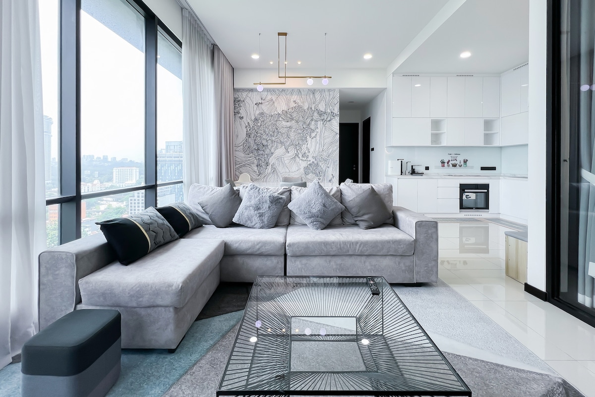 Grand Loft okkar er fullt af alls konar þægindum og aðstöðu sem þú þarft á að halda! Við erum búin hágæðahúsgögnum, afþreyingareiningu (karókí) og frábærum frágangi sem gefur ekki aðeins meira virði heldur einnig upplifun þína af því að gista hér. Við erum í aðeins 15 mínútna fjarlægð frá miðborginni, 5 stoppistöðvum frá Bukit Bintang (Pavillion) og 6 stoppistöðvum frá KLCC með lest. Við erum vel staðsett með 4 mínútna göngufjarlægð í gegnum verslunarmiðstöðina að MRT-stöðinni við lv 1