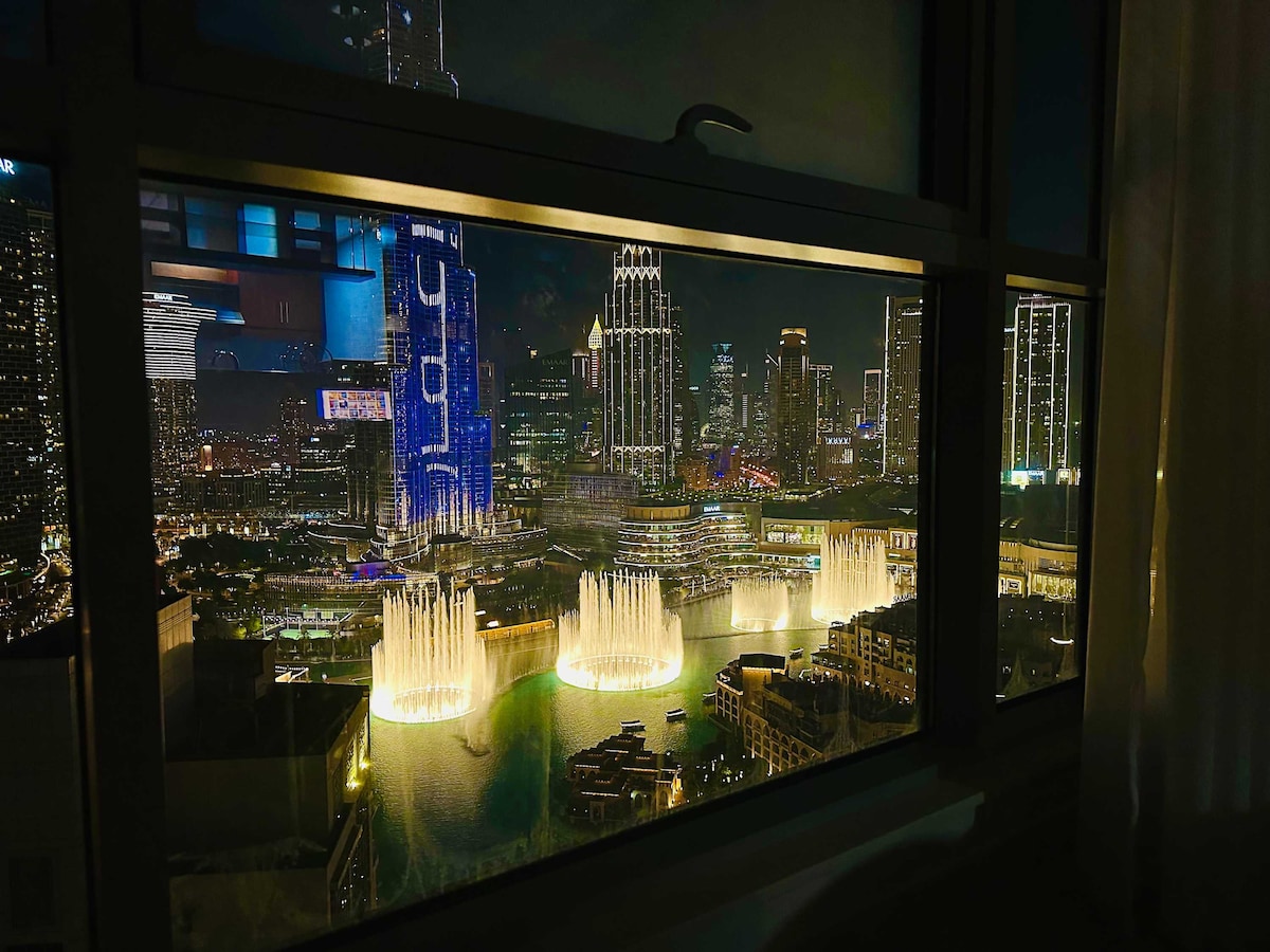 Premium íbúð með töfrandi fullbúnu útsýni yfir Burj Khalifa og hluta gosbrunninn. Eignin í fyrstu röð er staðsett í hjarta miðbæ Dubai, rétt við hliðina á Burj Khalifa, 100 metra frá Dubai Opera og 200 m. frá Fountain/Dubai Mall. Það er eina byggingin með beinni neðanjarðarlest og verslunarmiðstöð. Falleg sundlaug, líkamsræktarstöð og tennisvöllur eru í boði. Íbúðin er með persónulegan aðstoðarmann, ÞRÁÐLAUST NET, snjallsjónvarp með Netflix, king size rúm og svefnsófa. Njóttu ferðarinnar til Dubai.