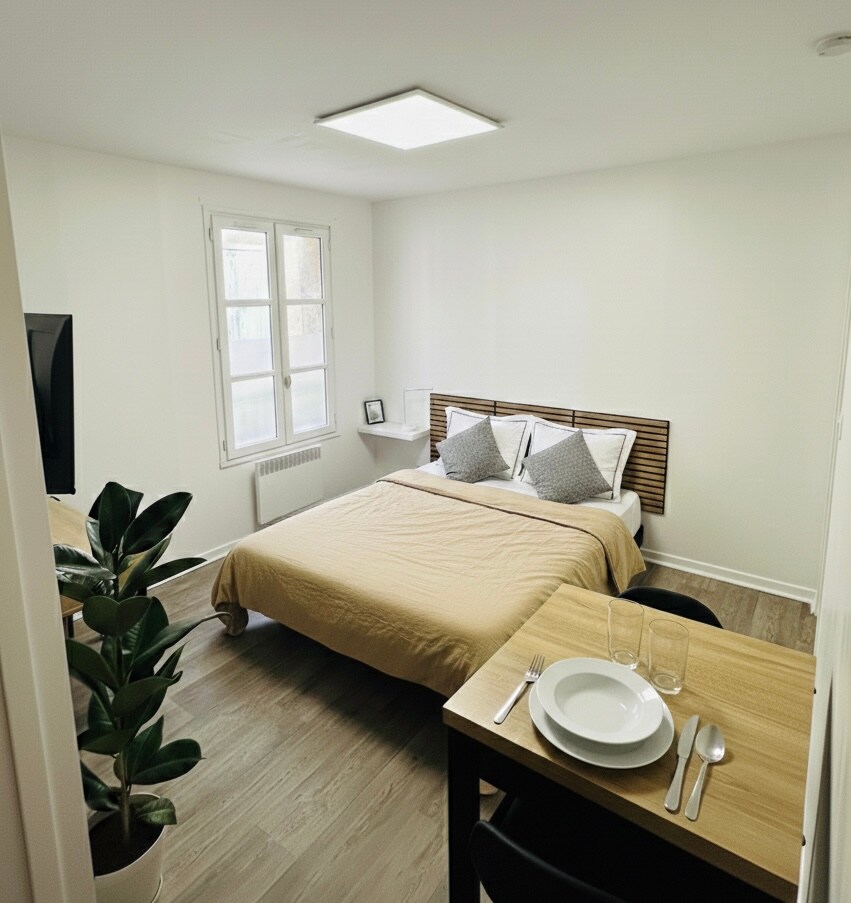Pretty endurbætt stúdíó á 28m2 þar á meðal: -rúm,svefnsófi, ( allt er nýtt), flatskjásjónvarp, borðstofa fyrir 4 manns. -eldhús með framköllunarplötum, uppþvottaáhöldum, kryddum, ísskáp,örbylgjuofni og Nespresso-kaffivél. - Baðherbergi (nýtt) WC-loft sturta og vaskur. Helst staðsett í gistiaðstöðunni: - 5 mín ganga frá hjarta bæjarins með Place Maréchal Leclerc -12 mín með bíl frá futuroscope -2 mín af krana - 6 mín frá IAE Poitiers.