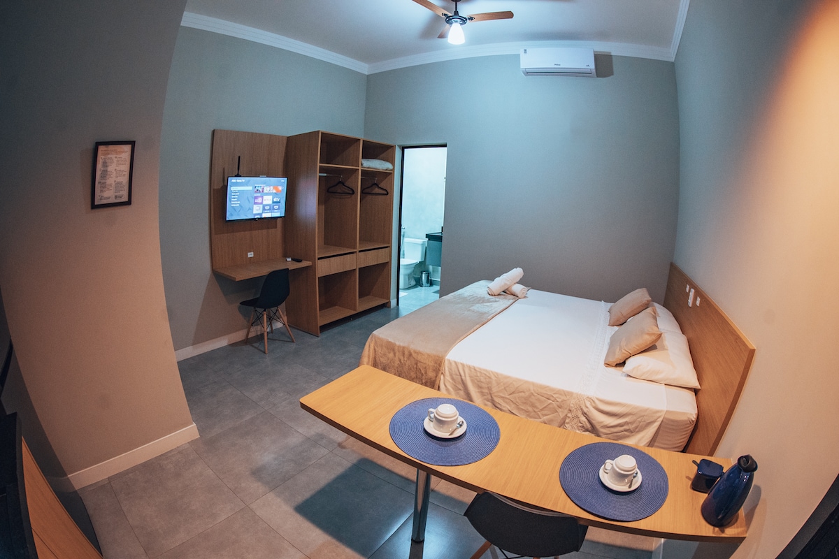 Nosso Studio possui 45m2 e uma localização privilegiada em Bauru. Se encontra ao lado do Bauru Shopping, na rua de bares, restaurantes, próximo ao Centrinho/Usp, CPO e FACOP. É um espaço moderno, aconchegante, cheio de estilo, conforto e climatizado. Com certeza sua reserva não trará uma simples hospedagem, mas sim uma experiência maravilhosa e marcante. O prédio possui portaria 24 horas, academia, mercadinho e lavanderia