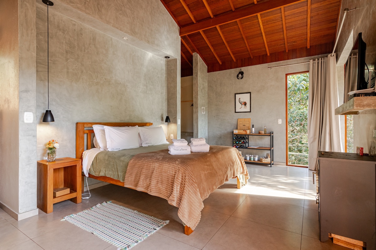 Discover "Mirante da Coruja", a tranquil refuge amidst the treetops, built with reclaimed pinho de riga wood. This glass-walled chalet provides privacy, comfort, and stunning views. Equipped with a fireplace, a private deck, and a spacious terrace, it becomes the perfect backdrop for special celebrations and relaxing moments, combining local art authenticity with the magnificent surrounding nature.