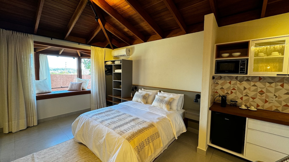 A taxa de serviço fica por nossa conta! Espaço de autocuidado, paz e relax preparado com muito carinho para receber você! Loft ideal para 2 pessoas: - quarto/cama queen, - ar-condicionado, - cozinha completa, - 1 banheiro, - hidromassagem com ducha externa. - disponibilizamos roupão a partir de duas diárias. Área comum: - estacionamento, - área de lazer, - piscina semi-aquecida, - churrasqueira (mediante taxa de uso). A 1km do centro de Pirenópolis.