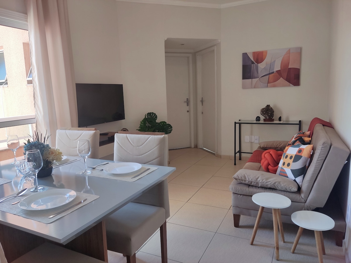 Njóttu þæginda og stíl í miðbæ Cachoeira Paulista með ótrúlegu útsýni yfir Mantiqueira. Staðsett nálægt Canção Nova og INPE, fullkomið fyrir pílagríma, rannsakendur og viðskiptaferðamenn. Njóttu þægilegs umhverfis með 2 svefnherbergjum (1 svíta), 2 baðherbergjum, eldhúsi og stofu búinni 43 tommu snjallsjónvarpi, þráðlausu neti og bílastæði.