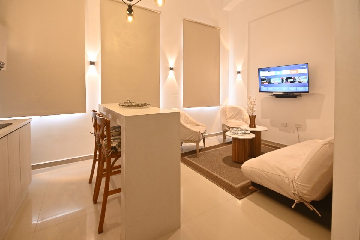 1 BR Loft svíta í hjarta Cartagena sem er innblásin af nokkrum af bestu 5 stjörnu hótelum heims. Staðsett innan veggja gömlu borgarinnar, í göngufæri við verslanir, afþreyingu, veitingastaði, næturklúbba og bari. Njóttu þess að dvelja í þessum Unesco Heritage bæ sem er fullur af sögu og spennu. Fullbúið eldhús með þvottavél/þurrkara, Queen-size rúmi, útdraganlegum sófa, sjónvarpi, Netflix og 400MbWi-Fi. Nútímalega strandstemmingin okkar er tilvalin fyrir par til að njóta og slaka á. Intagram @pombocartagena