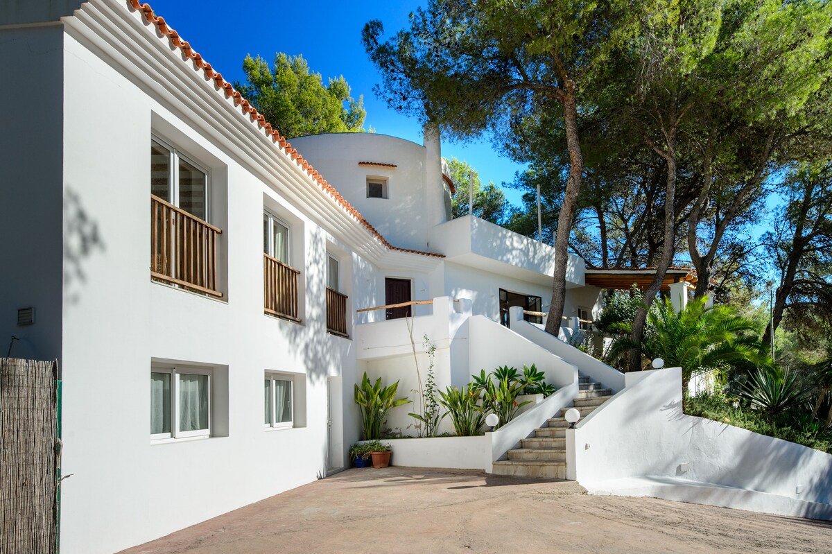 Charming, boutique-style villa nestled in a romantic green garden with old trees & flowers. With its terraces, chillout areas & a lovely little private pool the property offers great space & privacy for 8 to 9 guests. All 4 bedrooms with AC. Internet: high-speed fiber-optic! Within a 6min walk you reach the beautiful sandy beach of Cala Llonga. Restaurants, supermarkets, shops & taxi stand are only a 4min walk away. To Ibiza golf or Santa Eularia it's a 5min drive; to Ibiza Town it takes 12min.