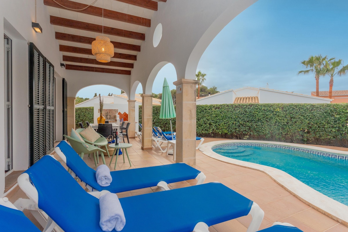 Rúmgóð 130 m² einkavilla með 250 m² útisvæði, staðsett í mjög rólegu íbúðahverfi nálægt Ciutadella. Í aðeins 4 mínútna göngufjarlægð er að finna matvöruverslun, veitingastaði og aðgang að ströndum Cala en Brut og Cala en Blanes. Engin þörf er á bíl. Hún er með þremur svefnherbergjum með hjónarúmi, tveimur baðherbergjum og svefnsófa og rúmar allt að átta gesti. Útisvæði með sundlaug, garði, verönd, laufskála og grilli. Loftkæling, hratt þráðlaust net, bílastæði, rúmföt og handklæði innifalin