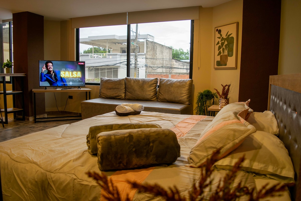 Loftíbúð á 7. hæð með ótrúlegum svölum og útsýni yfir garðinn. Það samanstendur af herbergi með hágæða king-size rúmi, baðherbergi og einka kommóðu, fullbúið með loftkælingu, 300mb þráðlausu neti, öryggishólfi, snjallsjónvarpi með Netflix áskrift og nokkrum sjónvarpsrásum. Eldaðu með áhöldum. Hayedo de Juanambu byggingin er með móttöku með einkaöryggi allan sólarhringinn, lyftum , yfirbyggðum bílastæðum, líkamsræktarstöð , tyrknesku, vinnuaðstöðu, sundlaug á 9. hæð.