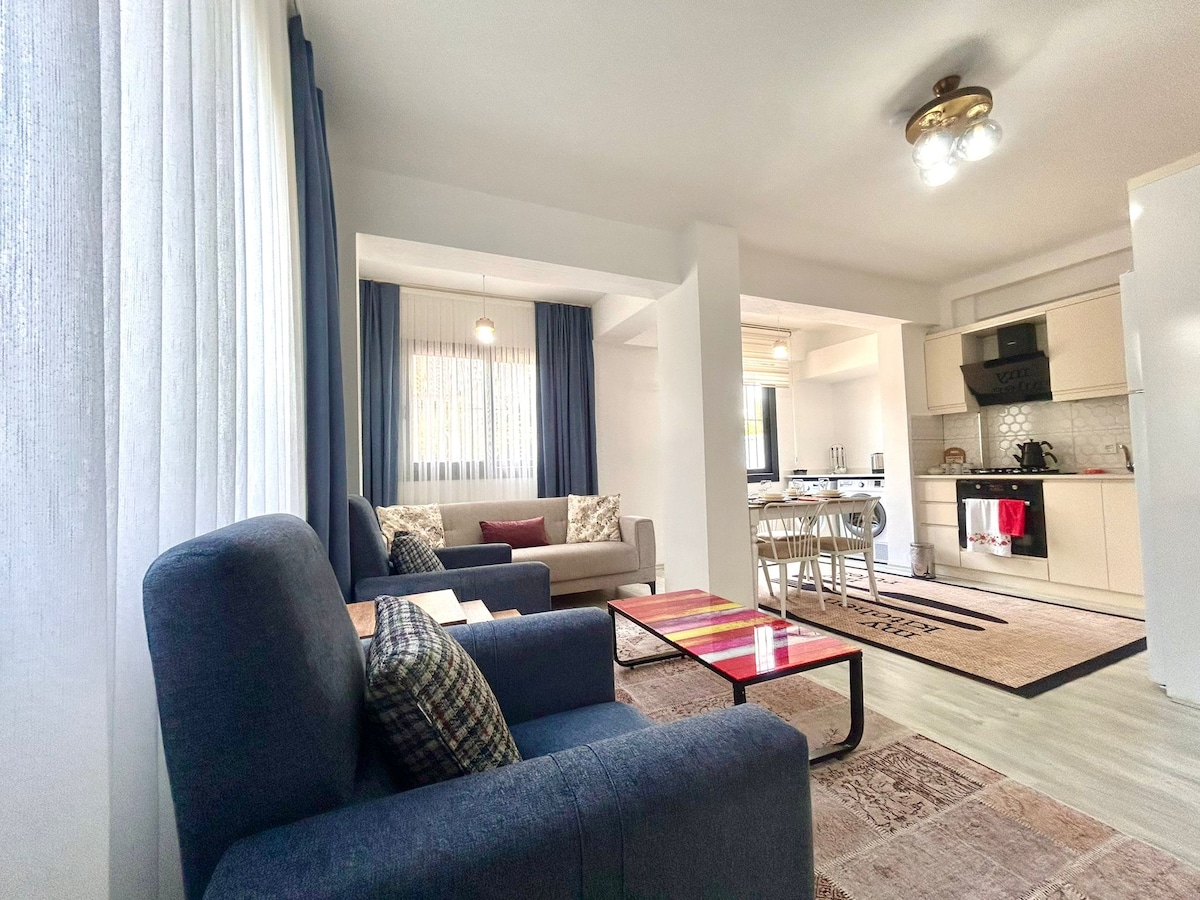 Það er í göngufæri við markaði, rútustöð og Erasta-verslunarmiðstöðina. Ölüdeniz ströndin er í 11 km fjarlægð, miðstöðin er í 2 km fjarlægð. Aðskilinn inngangur, aðskilinn garður, bílastæði, verönd. Þú getur grillað í garðinum. Það er 1 hjónarúm, 2 einbreið rúm, 1 gormadýna með bæklun, 1 svefnsófi og 1 barnarúm. Loftræsting er í öllum herbergjum Háhraðanet er til staðar. Það eru 55 tommu Samsung sjónvarp og 40 tommu LG-sjónvarp. Í eldhúsinu eru nauðsynlegir hlutir til að elda og borða.