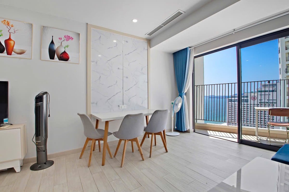 Njóttu yndislegrar upplifunar í íbúð Marina Suites Nha Trang. Handklæðum og rúmfötum er skipt út að fullu, íbúðin verður gufusoðin með ilmkjarnaolíum áður en gestir koma á staðinn. Þetta er þægilegasta og þægilegasta tilfinningin. Íbúðin er fullbúin húsgögnum fyrir viðskiptavini með langtíma frí, ..... Þægileg staðsetning í miðborginni, aðeins 400m frá ströndinni. 150m frá Dam round market. Staðsett við hliðina á matvöruverslun sem er opin allan sólarhringinn, almenningsgarði, veitingastöðum, miðsvæði,...
