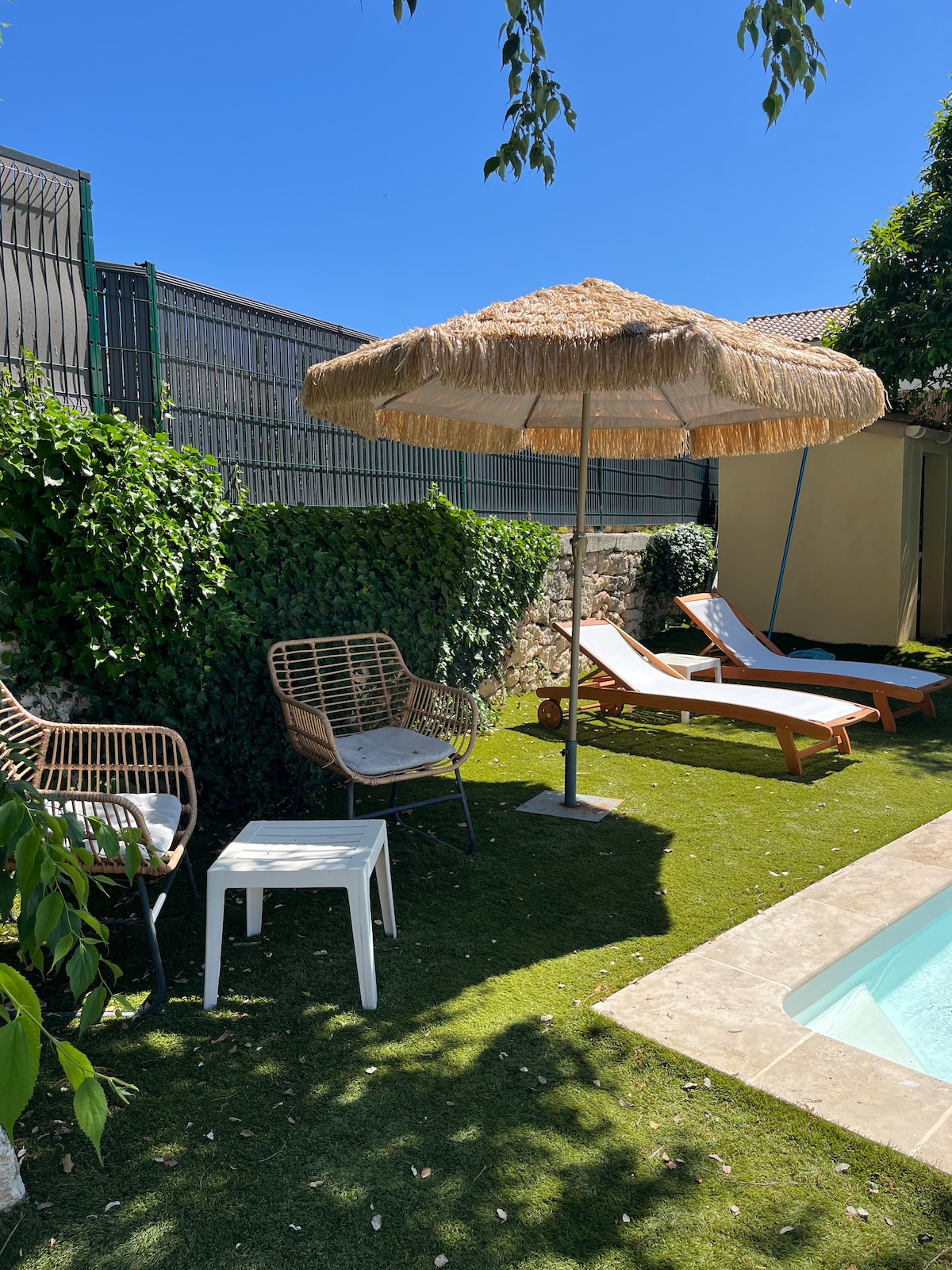Háð 27m2 , hjónaherbergi við hliðina á húsinu okkar. Sundlaug sem er sameiginleg með húsinu. Sérinngangur án samliggjandi veggs með villunni Verönd með borði undir pergola er frátekin fyrir þig. rúmföt í boði fyrir þig. Þetta er ekki stúdíó og því er hvorki alvöru eldhús né vaskur. Eignin neðst er hins vegar með ísskáp/ frysti, örbylgjuofni , kaffivél, brauðrist og diskum. Sykur, te, kaffihylki í boði.
