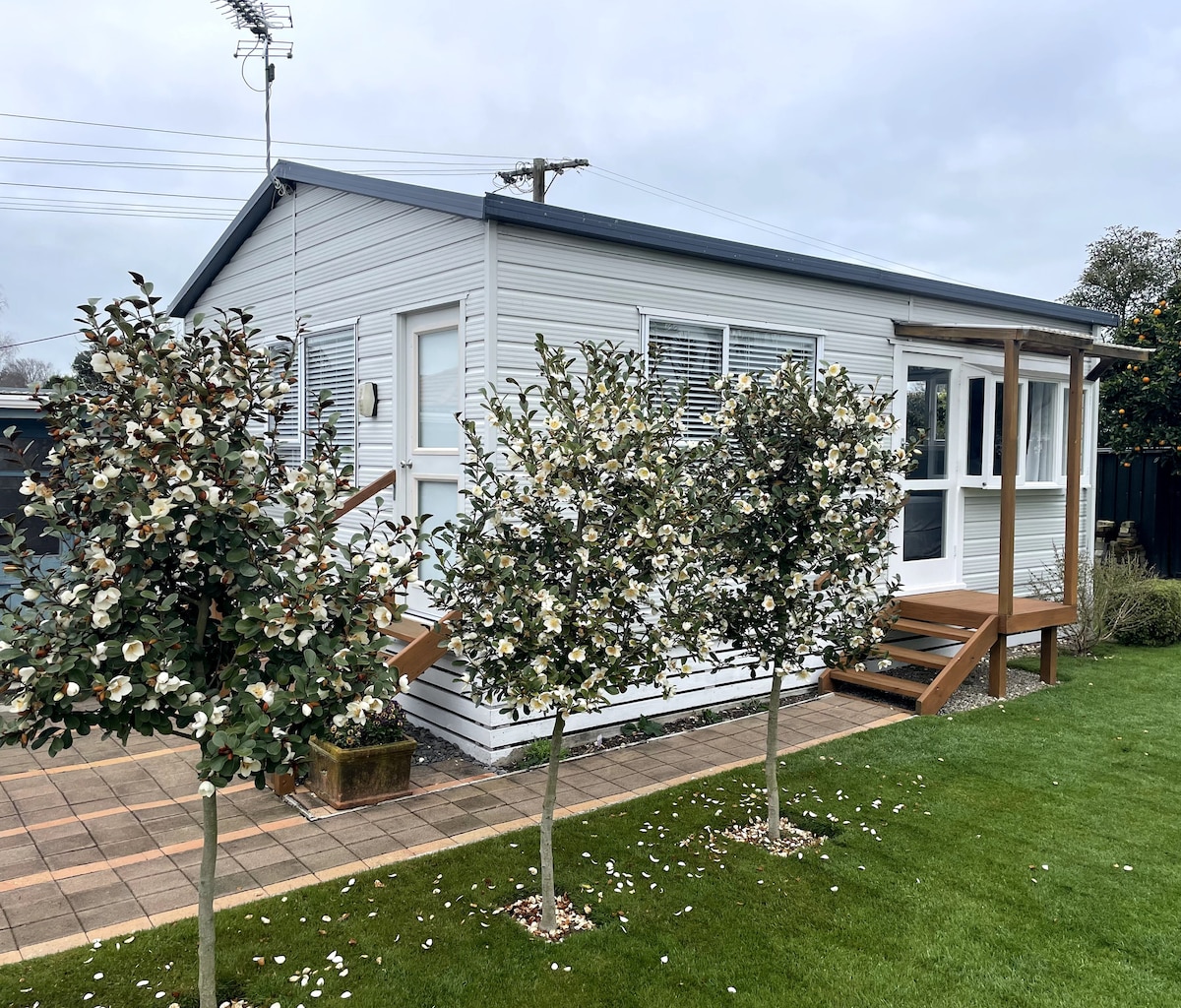 Fallegur og þægilegur kofi fyrir tvo fullorðna. Það er í 10 mínútna fjarlægð frá Karapiro-vatni og Cambridge. Velodrome, Hamilton-flugvöllur og Mystery Creek eru í 15 mínútna fjarlægð. Afslappandi umhverfi í görðum í rólegu hverfi. Í eldhúskróknum er ketill, örbylgjuofn og brauðrist en hvorki helluborð, eldavél né ofn. Vinsamlegast hafðu í huga að þar sem skálinn er í íbúðahverfi verða allir viðbótargestir að fara fyrir 22:00.