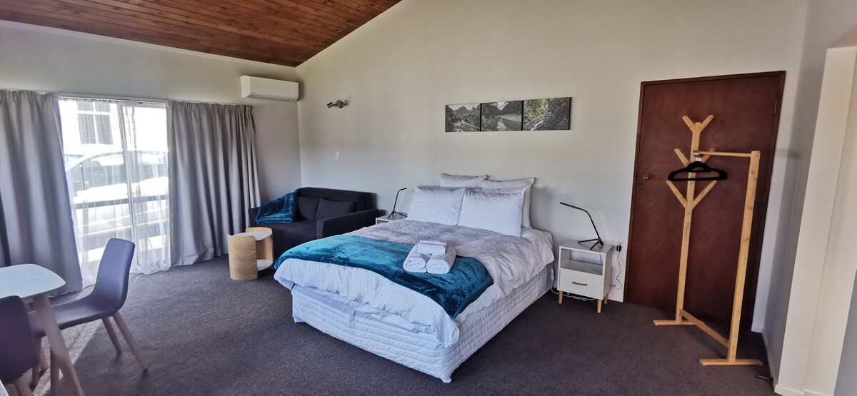 Located close to town, parks, cycle tracks, trails and cafe. Studio unit is self-contained, separate entrance, off road parking, self check in, kitchenette, laundry, shower, separate toilet. Deck overlooks vegetable garden. The unit & garden are private and quiet. ELECTRIC VEHICLE charging available. Secure storage for motorbikes & cycles. Unit has queen bed, heat pump/air-con. Tea/coffee/milk, light breakfast foods provided. Babies OK if you provide portacot, advanced notice needed.
