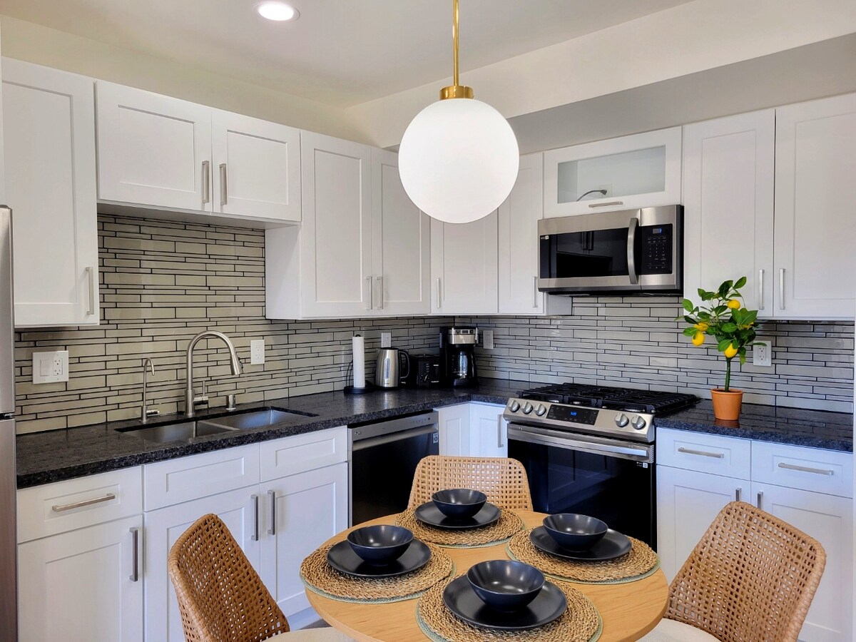 **Nýlega uppfært**Þetta 526 fermetra draumahús fyrir orlofsgesti með 1 svefnherbergi, 1 baðherbergi og afgirtri einkaverönd. Gestahúsið er fullbúið með öllu sem þú þarft, þar á meðal upphitun, loftviftum, streymisjónvarpi með YouTube sjónvarpi í stofu og svefnherbergi, þvottavél og þurrkara, fullbúnu eldhúsi sem er fullbúið, stofu og öllu sem þú þarft fyrir ævintýradag á ströndinni. Það er fullbúið baðherbergi með fallegri sturtu.