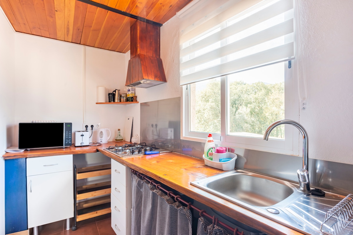 Estamos en el corazón de Les Guilleries, a 950 m altitud en un " Espai Natural protegit". Es un lugar ideal para descansar y hacer actividades. Es una masía restaurada, con espacios acogedores, actualizados y un aire rústico. El entorno permite aislarte del mundo, (9 km de pista forestal en buen estado). El núcleo urbano más cercano esta a 18 km, pero también esta cerca de lugares interesantes de visitar (históricos, culturales, gastronómicos..). El prado es una extensión del apartamento.