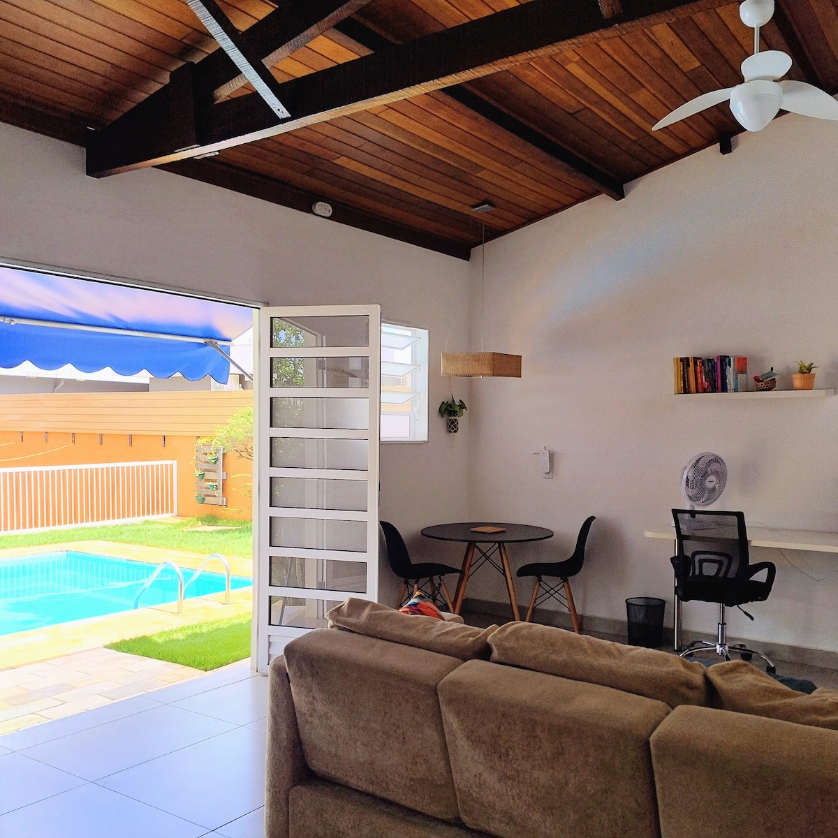 Gestahús í bakgarði heimilisins, aðskilið, einkaaðgangur að sundlauginni! - Ísskápur, örbylgjuofn, vatn, loftsteikjari, kaffivél og rafmagnsketill: kaffi, cappuccino, te og ostabrauð í morgunmat! - Hjónarúm, loftvifta, fataskápur - Hvíldarsófi, borðstofuborð og vinnuborð - Sjónvarp með 120 rásum + Netflix, Disney+, HBO Max, AppleTV og Globoplay - Eitt bílastæði - Veitingastaðir og verslanir í göngufæri - Nærri Lagoa do Taquaral