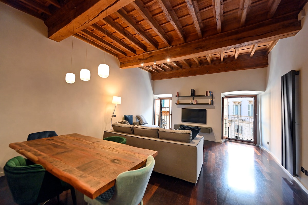 Kveiktu á stóra steineldinum og slakaðu á með bók á þessu glæsilega heimili með útsýni yfir Via dei Banchi Nuovi. Notaleg herbergi í afslöppun, hlutlausum tónum með húsgögnum og upprunalegum málverkum eiganda. Þetta heillandi fullbúna hús er staðsett á einu fallegasta, forna og líflegasta svæði miðborgar borgarinnar. Við viljum einnig bjóða upp á vistvæna gestrisni: við notum rafmagn frá endurnýjanlegum orkugjöfum, lífrænum vörum.