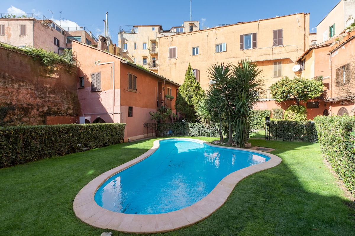 Glæsileg íbúð í sögulegri byggingu frá 17. öld umkringd íbúðargarði með sundlaug. Staðsett í hjarta Trastevere , eins af mest einkennandi hverfum Rómar. Það er auk þess á góðum stað að gera þér kleift að komast á stuttum tíma til allra annarra sögulegra, listrænna og fornleifastaða borgarinnar: San Pietro, Colosseum, Pantheon, Trevi-gosbrunninn, Campo de 'Fiori, Piazza di Spagna, Piazza Navona, Castel Sant' Angelo