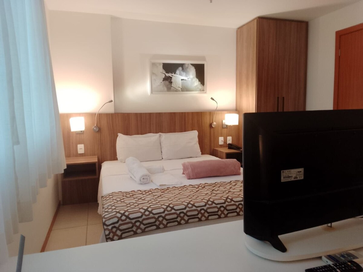 Curta uma experiência elegante neste lugar bem-localizado. Bem próximo de supermercados, padarias, restaurantes e todo tipo de comércio. Melhor localização da cidade com todo o conforto do serviço de um flat. Café da manhã não incluso, mas oferecido pelo restaurante do hotel, bem como almoço e jantar. Academia e sauna no predio. Estacionamento na rua.