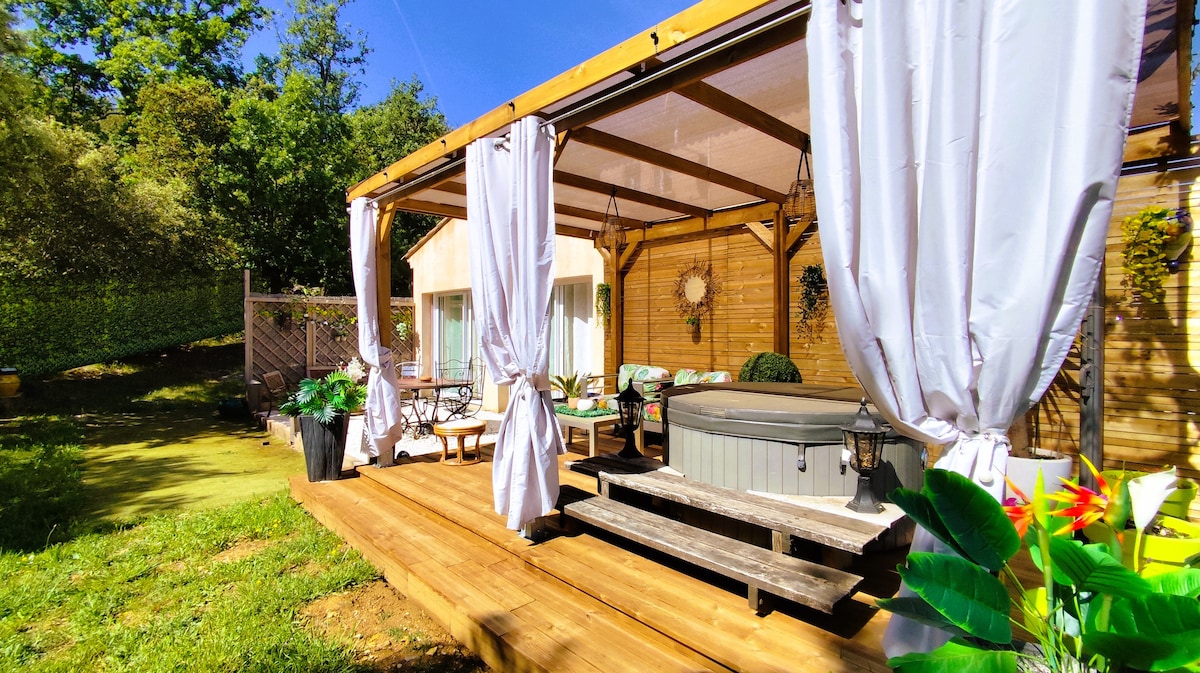 Sökktu þér í einkavæddan hitabeltisgarð í algjöru næði og úr augsýn. Þessi litla paradís meðfram ánni og lulled af söng cicadas og fugla, mun veita þér algert breytt landslag. Boð um að ferðast! Þú munt njóta einkasundlaugar og fallegs einkaupphitaðs nuddpotts með útsýni yfir garðinn. Fíkjuræktargarður, dreifður yfir fallega grasflöt sem liggur að ánni og fyllir þetta landareign
