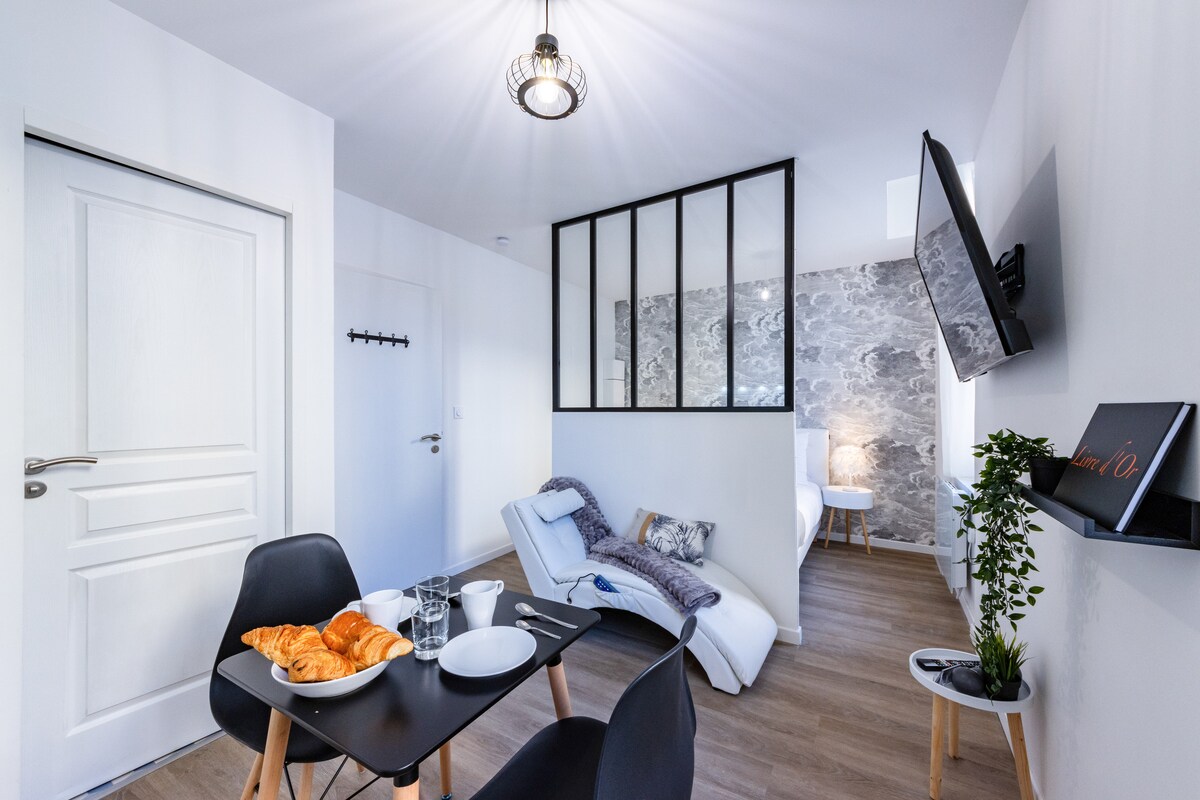 Slakaðu á og njóttu næturlífsins með 2ja sæta sánu. Sjálfsinnritun með lyklaboxi og ókeypis bílastæði á gangstéttinni. Notaleg íbúð fyrir tvo, endurnýjuð með öllum þægindum fyrir lítil dagleg þægindi. Rafmagnssófi sem gerir þér kleift að leggjast niður til að njóta góðrar Netflix-myndar/ þáttaraðar. Mjög vel staðsett með öllum þessum þægindum í 1 mín. göngufjarlægð; Reykingar, banki, apótek, matvöruverslun, bakarí og slátrari . Svefnherbergi: 160/200 rúm.