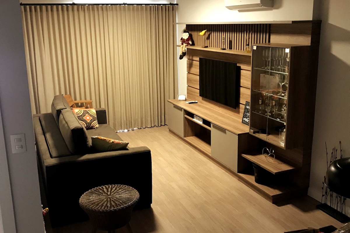 Spectacular Apartment Suite, með svefnherbergi fyrir tvöfaldur, stofa 2 herbergi og eldhús, allt húsgögnum að háum gæðaflokki, með frábæru útsýni. Nútímalegt, með öllum þeim úrræðum sem eru í boði til að gera dvölina eftirminnilega, við hliðina á fallegasta útsýni Serra Gaúcha. Mjög grænir, tómstundir og þægindi í kringum þig. Það er með heitan pott, umhverfislýsingu, ísskáp, örbylgjuofn o.s.frv.