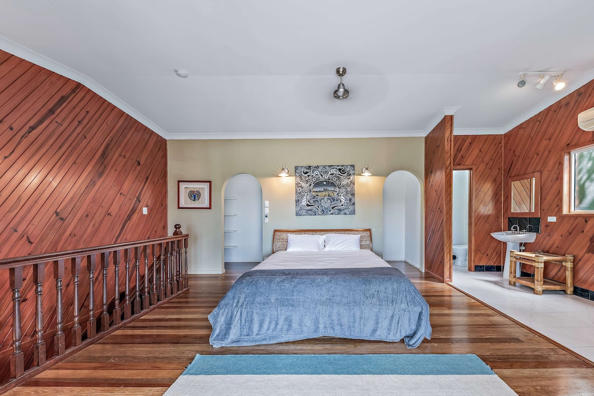 Kick back & relax in a stylish 1 bedroom guest house. The interior is comfortable & fresh with ensuite bathroom, kitchenette & lounge area. Room opens out to large deck nestled in landscape gardens & natural rainforest. BBQ in a nature rich outdoor setting, visit nearby beaches for a beach picnic using beach umbrella & picnic basket provided. Large free parking area for boat, trailer and/or caravan. This 65m2 space has TV, recliner chairs, coffee table, Wifi, coffee machine, air fryer.