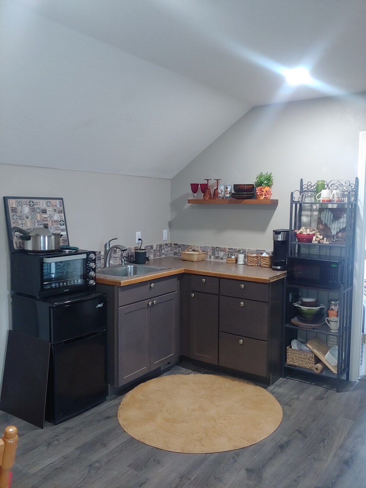 April Specials! **No Pets** Enjoy a stylish experience at this centrally-located place. Newly remodeled stand alone home that is a tastefully transformed garage. Queen sized bed in upstairs low ceiling loft space. Full kitchen and bath with tiled walk in shower. New air conditioner and heater wall unit. 5 min walk to Northwest Nazarene College, minutes away from downtown Nampa, Hospitals, Grace Assisted Living and Ford Idaho Center arena. Covered carport parking for 1 vehicle.