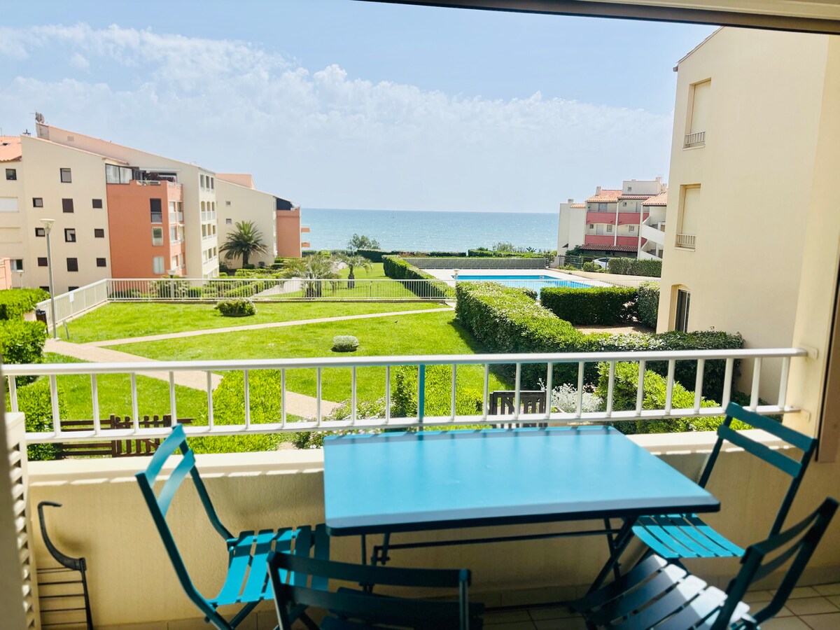 Íbúð með verönd fyrir fimm manns (þráðlaust net, loftkæling...) með útsýni yfir stóru sundlaugina með sólbekkjum og róðrarsundlaug, bílastæði í íbúðinni við sjóinn... Mjög vel staðsett, þú getur gert allt án bíls: strönd, verslanir, hafnarmiðstöð, veitingastaðir.. Þú hefur gönguaðgang á 4 mínútum að ströndinni í La Conque , plagette... Strætisvagnastöð er við rætur húsnæðisins (Agde station/residence).