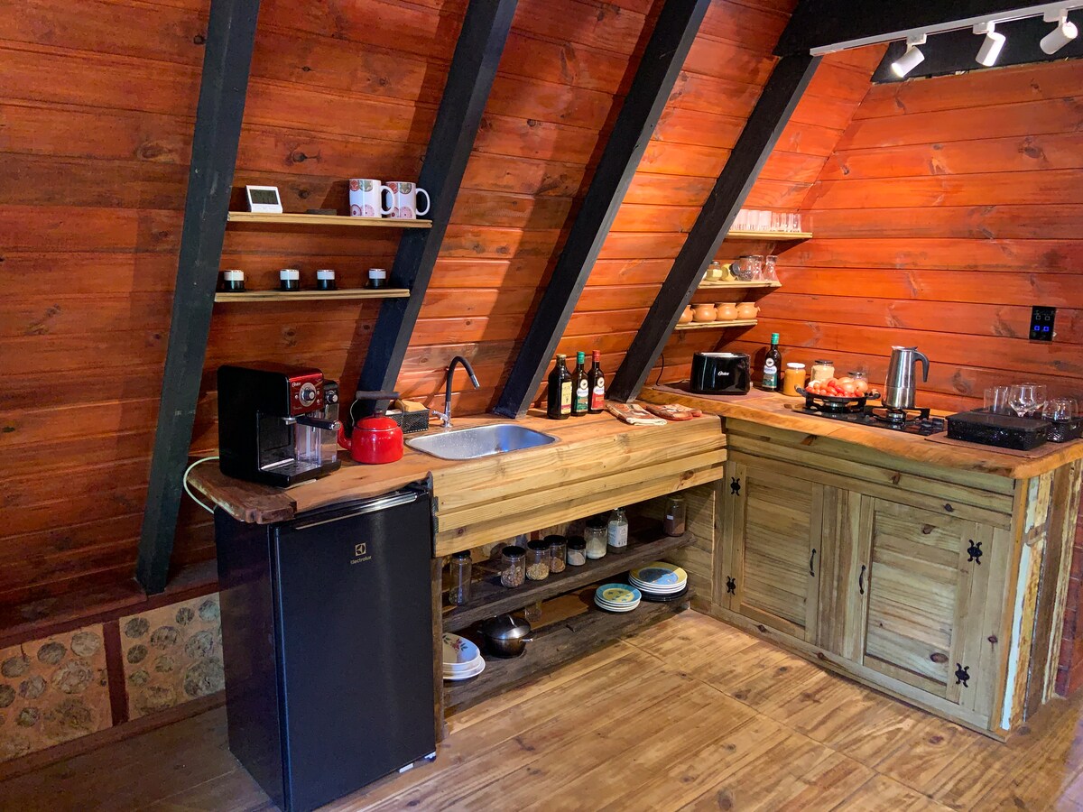 Seriema skálinn er 38 m² dreifður á notalegan og hagnýtan hátt og er fullkominn valkostur fyrir þá sem vilja þægindi, þögn og innlifun í náttúrunni. Gistingin er með útbúið eldhús, stofu með sófa og skrifborði ásamt heillandi mezzanine þar sem rúmið er staðsett með hrífandi útsýni yfir innfædda skóginn. Í skálanum er heit sturta og salerni innandyra. Viðargólf og sveitalegar innréttingar, með handgerðum munum, skapa notalegt og samstillt andrúmsloft í umhverfinu.