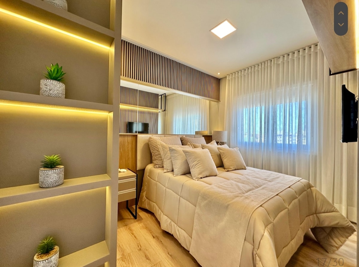 Slakaðu á í þessu hljóðláta og stílhreina rými, íbúð með 1 svefnherbergi og baðherbergi og þú þarft ekki að koma með neitt , þráðlaust net, kaffivélarsnjall, þvottavél og þurrkara , queem-rúm, handklæði og rúmföt o.s.frv.... Frábær íbúð í Navegantes með verönd í byggingunni með sjávarútsýni, fjöllum og stöðuvatni fyrir þennan chimarão dagsins. Með líkamsrækt og þaki sleppt. Nei !!!! Leyfilegt að taka frá tíma og hvorugri notkun á HEILSULIND og orlofsherbergi fyrir inquelinos !!!!