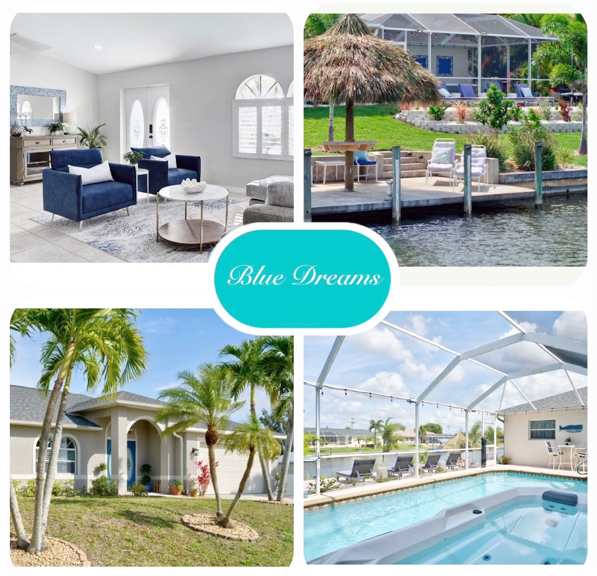 -5 min to Downtown Cape/10 min to Yacht Club Beach, 20 min to Causeway Beach, 25 min to Ft Myers & Sanibel Beach -Tropical fenced backyard w/ pool, hot tub, gas firepit, swing chair, hammock & Blackstone grill -Beach essentials, boogie boards, umbrellas, beach wagon, cooler & chairs -Board games, ping-pong, corn-hole, darts, 2 kayaks+life jackets -2 Beach Cruiser bikes + helmets -Relaxing enclosed covered patio + string lights, neon sign & grass wall -Canal access for kayak launch 5 min away
