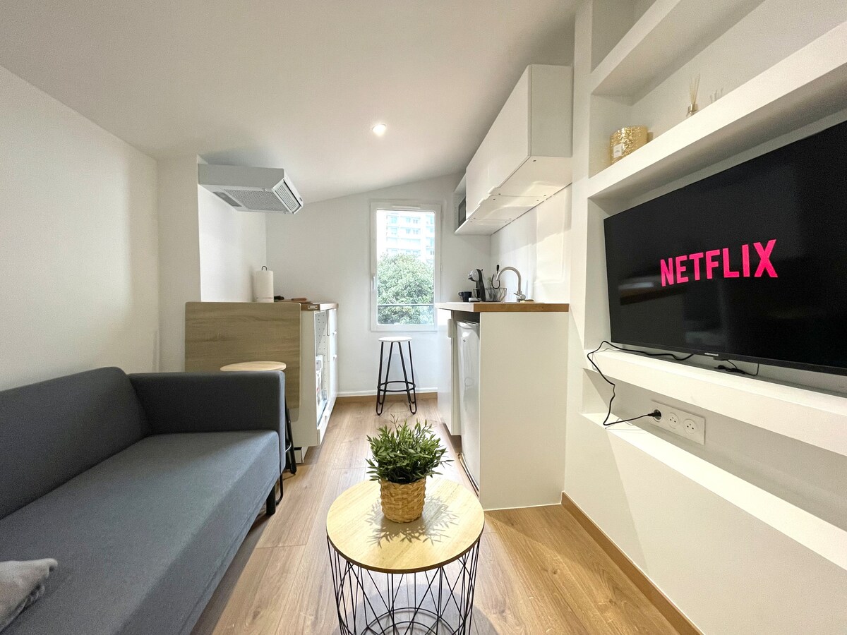 Nútímalegt 27 m2 stúdíó á jarðhæð í rólegu og öruggu húsnæði í Colomiers, í nokkurra mínútna fjarlægð frá Airbus og í 20 mín fjarlægð frá Toulouse. Fullbúið eldhús, þráðlaust net með trefjum, Netflix, vinnuaðstaða, þvottavél/þurrkari og rúmföt til staðar. Einkabílastæði innifalið. Sjálfsinnritun með snjalllás. Fullkomið fyrir viðskiptaferðir eða afslappandi frí.
