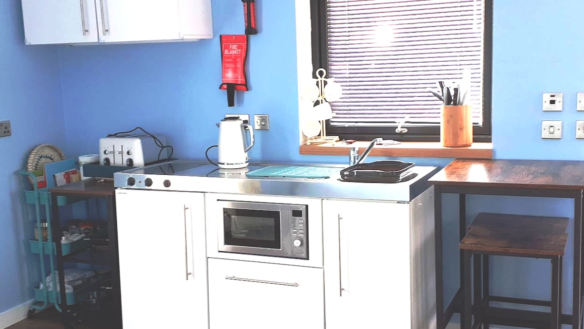 Licence: HI30062R. Chalet. 3 night stay or more. Located within the owners grounds 3 miles from Carbost. Transport essential. A combined living/bedroom/kitchen area provides: a comfortable KS bed, table with 2 chairs , large cupboard, kitchenette containing: fridge/freezer, dishwasher, combi microwave/grill, airfryer and toastie maker. Additionally there is a walk in wet room and a shed for boots and bikes. Outdoor seating is provided.