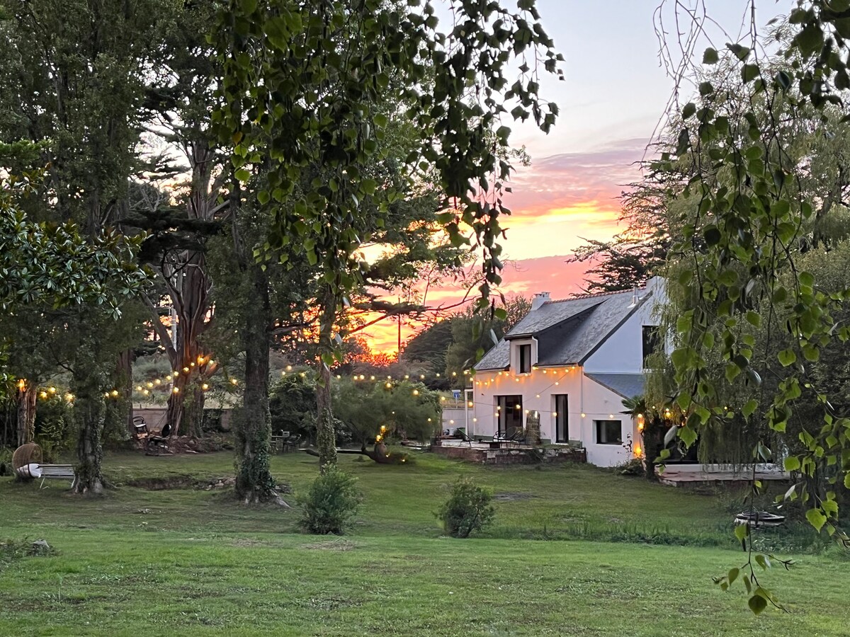 Langhúsið okkar er staðsett í hjarta Morbihan-flóa, í 10 mínútna fjarlægð frá sjónum: Arradon, Baden, Auray og bryggjunni fyrir Ile aux Mines. En einnig í 20 mínútna fjarlægð frá ströndum Carnac og miðborg Vannes. Húsið hefur nýlega verið endurnýjað að fullu (2024) og rúmar 10 gesti í 5 svefnherbergjum; 3 baðherbergjum og gufubaði á 200 m2 heildarflatarmáli. Hljóðlega staðsett, þetta er tilvalinn staður til að hvílast með fjölskyldu eða vinum í 5000 m2 skógargarðinum.