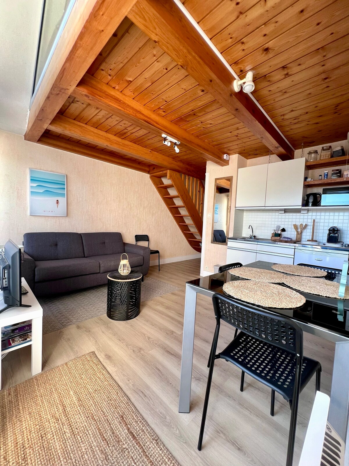 Til leigu stórkostlegur stúdíóíbúðarkofi 23 m2 sem var endurnýjaður að fullu árið 2020 + stór verönd á 1. hæð með útsýni yfir sjóinn, stóra strönd í Carnac. Einstakt útsýni yfir stóru ströndina og flóann Quiberon. Einkabílastæði í húsnæðinu. Hjólaherbergi, læst. Íbúð sem samanstendur af: - 1 skálainngangi, með 2 kojum - 1 endurnýjað baðherbergi 2020, - 1 aðskilið salerni - 1 stofa/stofa - 1 innréttað og fullbúið eldhús Veitingastaðir, bakarí á 5 mín Super U á 500m