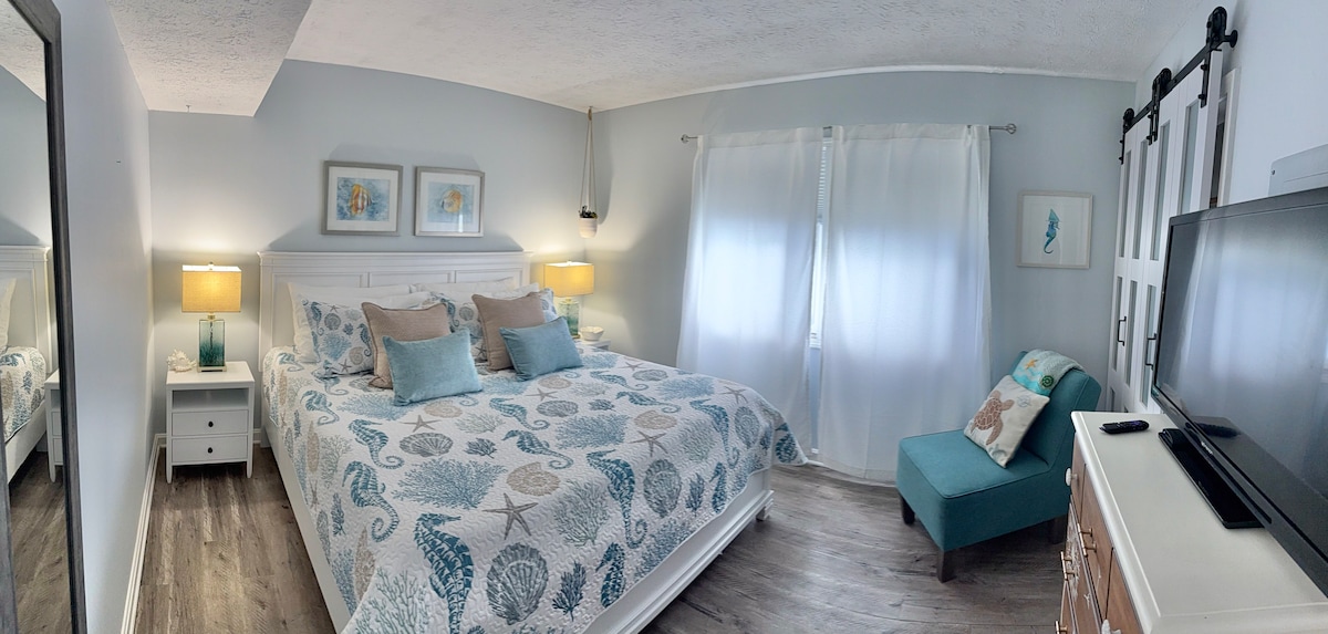 Stutt, 3 mínútna göngufjarlægð frá ströndinni! Eftir dag í hlýrri sólinni, svölum sjónum og mjúkum sandi er gaman að slaka á í þessari notalegu íbúð á neðri hæðinni. Þú verður með sérinngang, bílastæði, fullbúið svefnherbergi, eldhús, baðherbergi og yfirbyggða brekkugötu. Vaknaðu á kaffibar og farðu í stutta gönguferð eða styttri akstur til að fylgjast með fallegri sólarupprásinni yfir hafinu eða frá einni elstu fiskibryggju austurstrandarinnar í aðeins hálfs kílómetra fjarlægð frá miðborg Kure Beach.