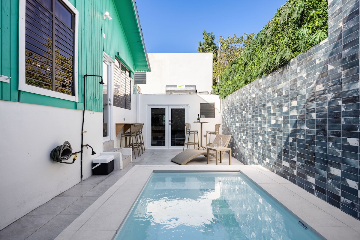 Þessi fullkomlega einka strandeign er hönnuð sérstaklega fyrir pör sem leita að rómantísku afdrep. Njóttu fulls aðgangs að einkasundlaug, garðskála, verönd og svítu á jarðhæð. Engin sameiginleg rými, engar truflanir, bara þið tvö í suðrænu afdrepinu ykkar. Smekklegt eldhús, rúmgóð stofa, notaleg verönd umkringd plöntum, einkabílastæði og þægindi fulls rafals og 500 lítra vatnstanks. 50 skref frá bestu ströndum Isla Verde nálægt Fairmont og Ritz-Carlton.