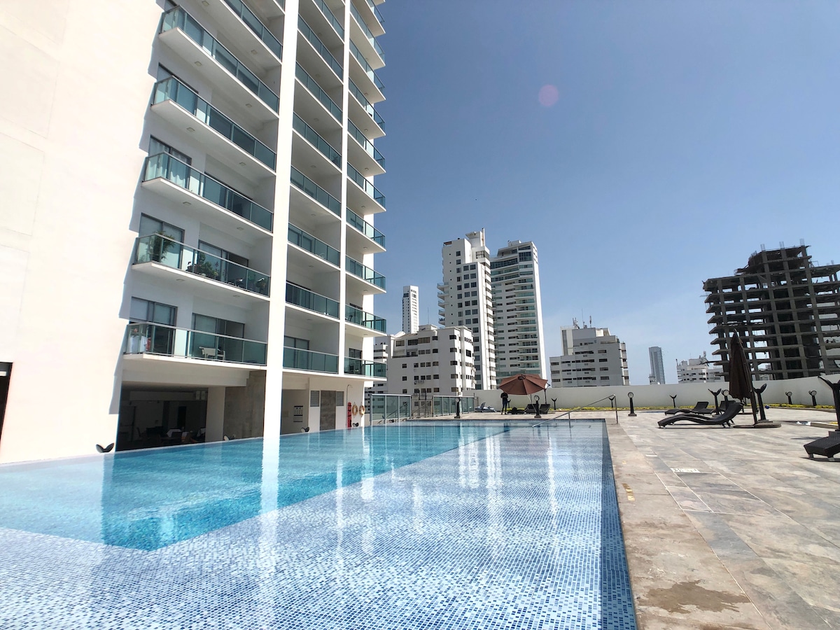 Notaleg íbúð með öllum nauðsynlegum þægindum fyrir ógleymanlega dvöl fyrir allt að þrjá einstaklinga í nútímalegu Magno Loft-byggingunni í Bocagrande. Öryggisgæsla er í byggingunni allan sólarhringinn og sundlaug. Íbúð með einu svefnherbergi, 2 fullbúin baðherbergi og loftkæling. Með 2 dásamlegum svölum með útihúsgögnum þar sem hægt er að njóta útsýnis yfir borgina og sjóinn. Opið eldhús með öllum nauðsynlegum eldhúsáhöldum, ísskáp, frysti og eldavél.