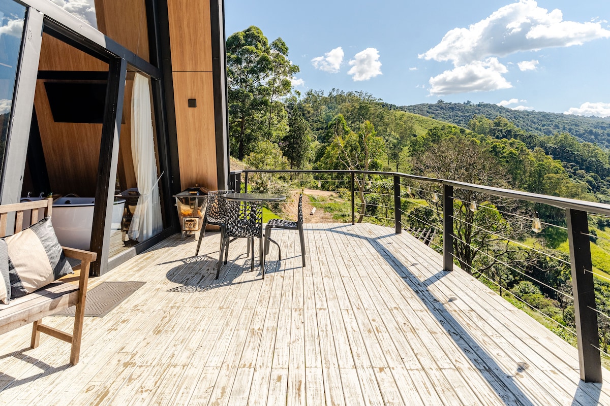 Kynnstu sjarma Serra da Mantiqueira í kofa sem er hannaður þannig að þú getir horft á sólarupprásina án þess að fara úr rúminu. Slappaðu af í upphituðu heilsulindinni okkar, stjörnuskoðun á loft- og sveiflunetinu. Í cabana er sambyggt herbergi með notalegu Queen-rúmi. Í stofunni/eldhúsinu rúmar mjög þægilegt fúton tvo gesti í viðbót og því er upplifunin tilvalin fyrir fjölskyldur. Í eigninni eru einnig slóðar og litlir fossar.