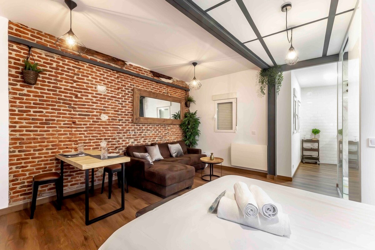 Þetta þægilega stúdíó býður upp á 17 m2 pláss fyrir allt að tvo. Hjónarúmið (150x200) og nútímalegt baðherbergi með sturtu gera þessa dvöl að fullkominni leið til að upplifa Madríd. Herbergið býður einnig upp á eldhúskrók og borðstofuborð svo að þú færð allt sem þú þarft fyrir hámarksþægindi og lágmarks stress.
