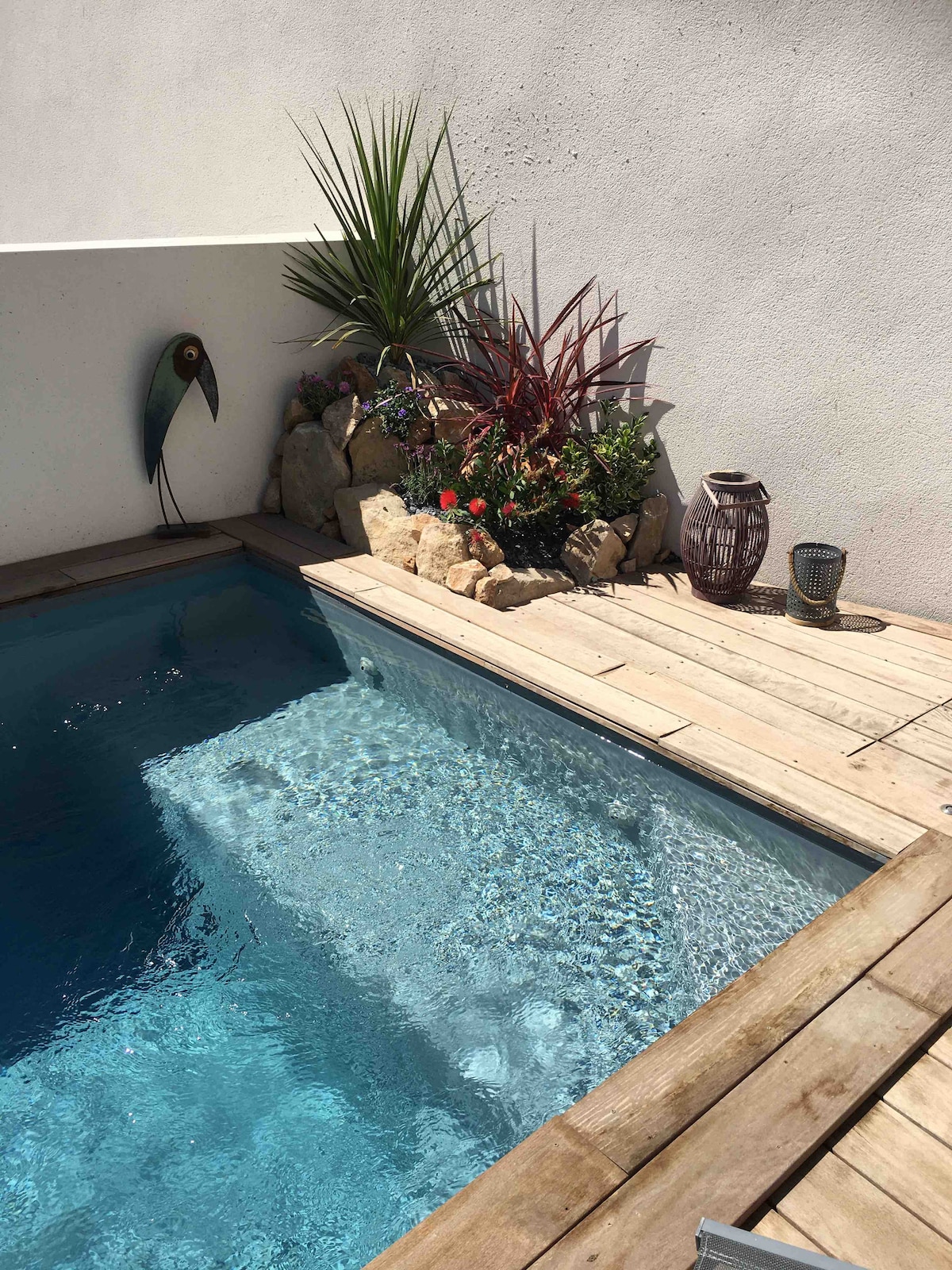Kyrrlátt og mjög sólríkt, þrepalaust hús. Allar verslanir í nágrenninu fótgangandi (200 metrar). 3 svefnherbergi - 2 hjónarúm og 2 einbreið rúm - 1 baðherbergi með baði og sturtu - Mjög gott stofurými með opnu eldhúsi (40m2) - Verönd með pergola - 7m x 3,5 x 1,5m djúp laug, fest (með hliði) og sólbekkjum.