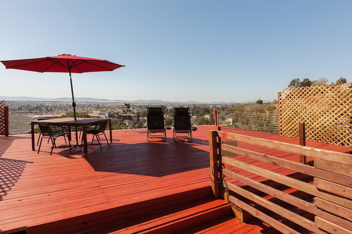 Einkagistihús staðsett í Oakland Hills með mögnuðu útsýni yfir flóann. Við vitum hve mikilvægt friðhelgi einkalífsins er að þetta gistihús gerir þér kleift að hafa allt sem þú þarft á að halda án þess að vera truflaður. Hægt er að njóta útsýnisins yfir sólsetrið frá rúminu eða veröndinni. Það er strætisvagnastöð í um 150 metra fjarlægð ef þú þarft, flugvöllurinn er í um 7 mínútna akstursfjarlægð, lestin (BART) er í um 5 mínútna fjarlægð og húsið er nálægt hraðbraut til að komast hvert sem er á Bay Area.