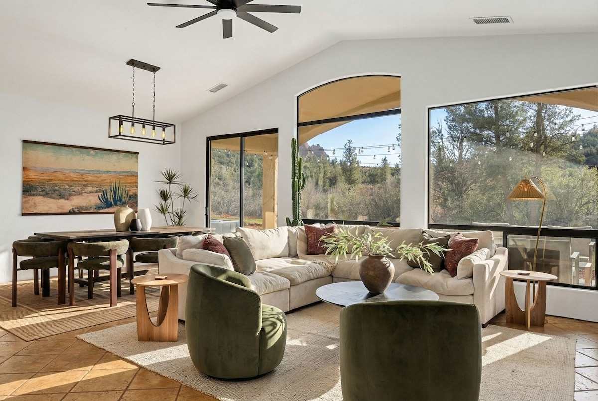Verðlaunað sem ein af „12 bestu gististöðunum í Sedona“ 100% ENDURBYGGÐ. HÁGÆÐA, FRIÐSÆLT, ÚTSÝNI, AÐGANGUR AÐ GÖNGUSTÍG OG EINKAVÖGLUNGUR! Dagspa stemning. Einkahús í rólegu hverfi í þekktu kapellu hins heilaga kross. Slakaðu á í sófanum með útsýni yfir rauðan klett eða farðu í 2 mínútna göngufjarlægð frá Broken Arrow-stígakerfinu! Viðarhólf, háþróuð tæki, sturtur með engri þröskuldum með handlögðum, spa-líkum steinsteypu gólfum, kassaleggur úr kvars, speglar með baklýsingu, vaskar úr óníx, strax heitt vatn, lúxusrúm, verönd, skrifstofa.