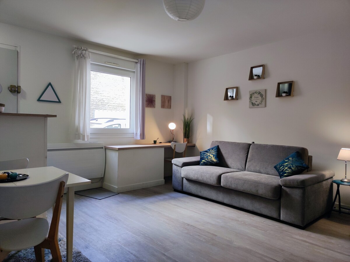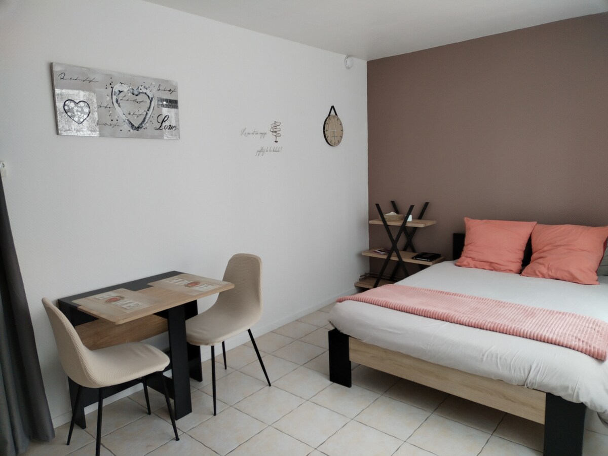 Húsnæði á 40m², endurbætt á jarðhæð, í hjarta "Bouchon de Champagne", miðborg Troyes. Útbúinn til að rúma allt að 4 manns á þægilegan hátt, verður rúm í svefnherberginu og þykkur svefnsófi í stofunni. Til þæginda finnur þú háskerpusjónvarp, Nespresso-kaffivél, fullbúið eldhús (ofn, ísskápur, diskar o.s.frv.)... og jafnvel strausett! Komdu og settu farangurinn þinn í heimsókn til Troyes!