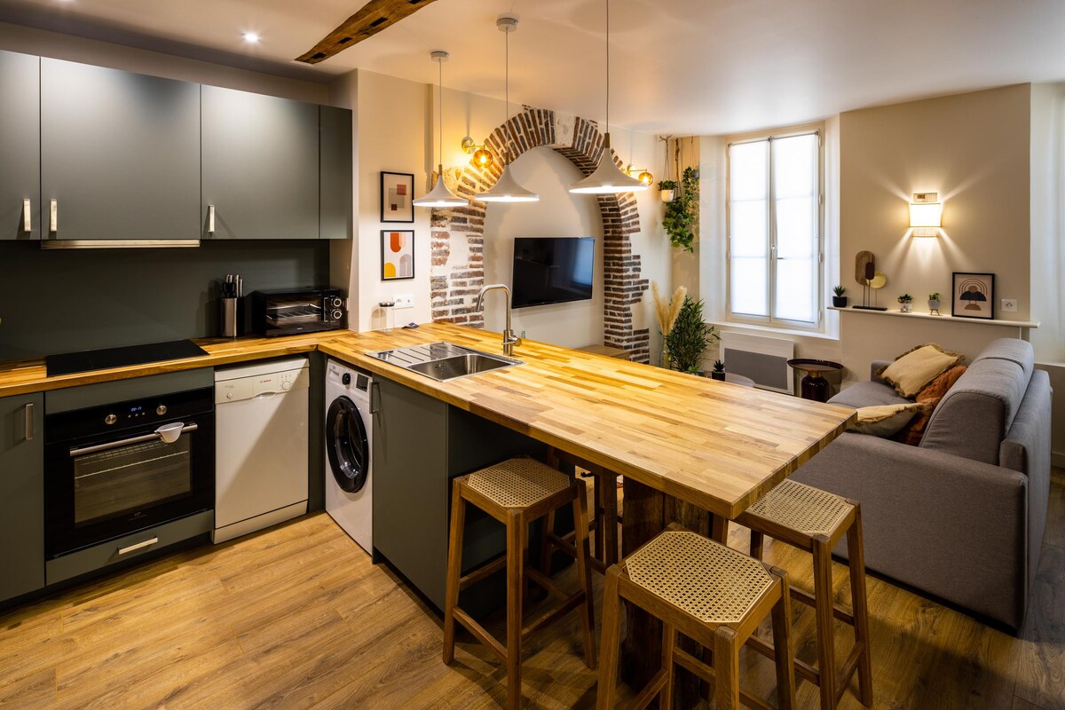 Njóttu glæsilegrar og hlýlegrar gistingar við litla göngugötu í hjarta Troyes með litlum innri húsagarði. Þessi þriggja manna íbúð sem er dæmigerð fyrir hálf timburhús hefur verið endurnýjuð að fullu (ATELIERS VALENTIN) og það er af ástríðu sem ég hef innréttað hana að fullu og skreytt. Bílastæði í nágrenninu, ókeypis miði meðan á dvölinni stendur. Til að heimsækja dómkirkju Saint-Pierre og Saint-Paul, viðarhúsin, fjölmiðlasafnið, hús verkfærisins o.s.frv....