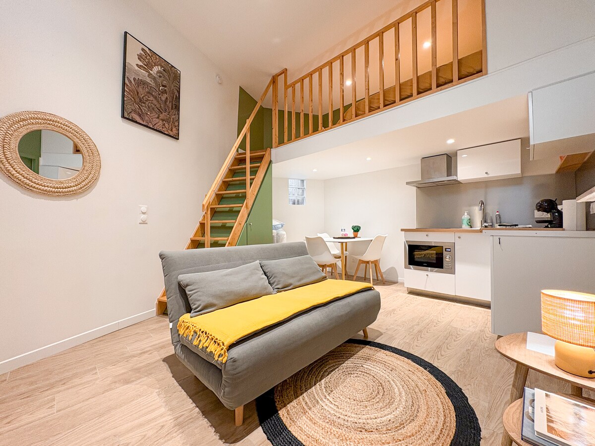 On the first floor of a pretty town house, this beautiful duplex apartment will seduce you with its large spaces, its magnificent terrace (25m2) completely private and sunny, its level of equipment and comfort, and its stylish decoration. It is the perfect place to discover Bordeaux, 2 tramway stations from the Place de la Victoire, and 4 from the Cathedral.