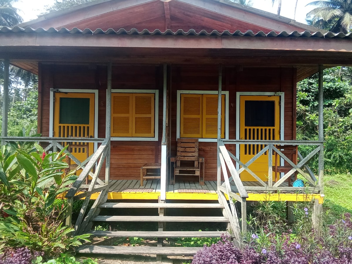 Einn af fallegustu og náttúrulegustu ströndum eyjunnar São Tomé er meira að segja sérstakur staður við Praia Jalé. Bústaðirnir okkar eru frábærir fyrir þægindi og útsýni yfir ströndina og bjóða upp á hljóð frá öldunum sem félagi, tilvalinn fyrir einn eða fleiri daga. Bústaðurinn okkar rúmar 1 eða 2 einstaklinga ( upphæðin er sýnd fyrir 2 einstaklinga; hafðu samband til að fá sérsniðið verð). Morgunverður og þráðlaust net er innifalið í virði dvalarinnar. Upphæð ferðamannaskattsins er innheimt á staðnum (2,10 evrur á mann fyrir hverja nótt).