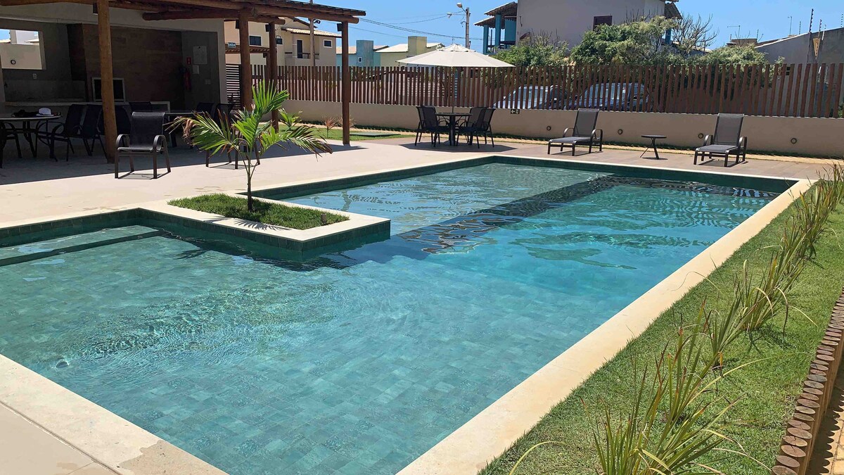 The house is located inside a private Condominium, which is just 740m far from the beach. The condominium has a security guard at the entrance gate, a complete leisure area (swimming pool, gym, courts, games room), and a magnificent pond measuring over 9,000m², ideal for those who love fishing or taking walks while admiring the sunset. The house has a private pool, 3 suites with ar conditioner, 1 suite with fan, all kitchen appliances, and security cameras on the front and back entrance doors.